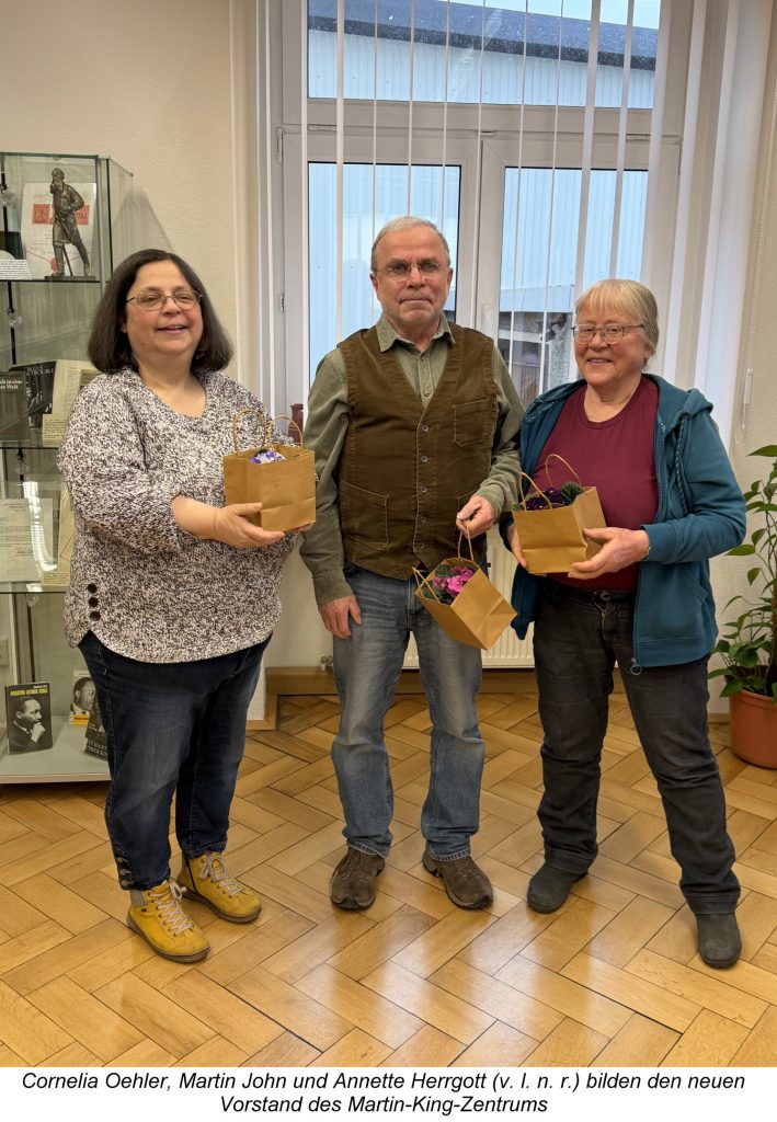 Das Martin-Luther-King-Zentrum hat einen neuen Vorstand. Die Mitgliederversammlung wählte im Februar 2026 Martin John erneut zum Vorstandsvorsitzenden. Als Stellvertreter des Vorstands wurden Annette Herrgott und Cornelia Oehler gewählt.